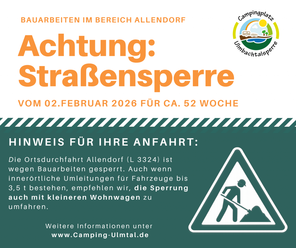 Die Ortsdurchfahrt Allendorf (L 3324) ist aufgrund von Bauarbeiten gesperrt. Auch wenn innerörtliche Umleitungen für Fahrzeuge bis 3,5 t bestehen, empfehlen wir unseren Gästen mit Wohnwagen oder Wohnmobil, die Sperrung zu umfahren und unseren Campingplatz von der A45 über Katzenfurt/Ehringshausen oder aus Richtung Herborn anzufahren.